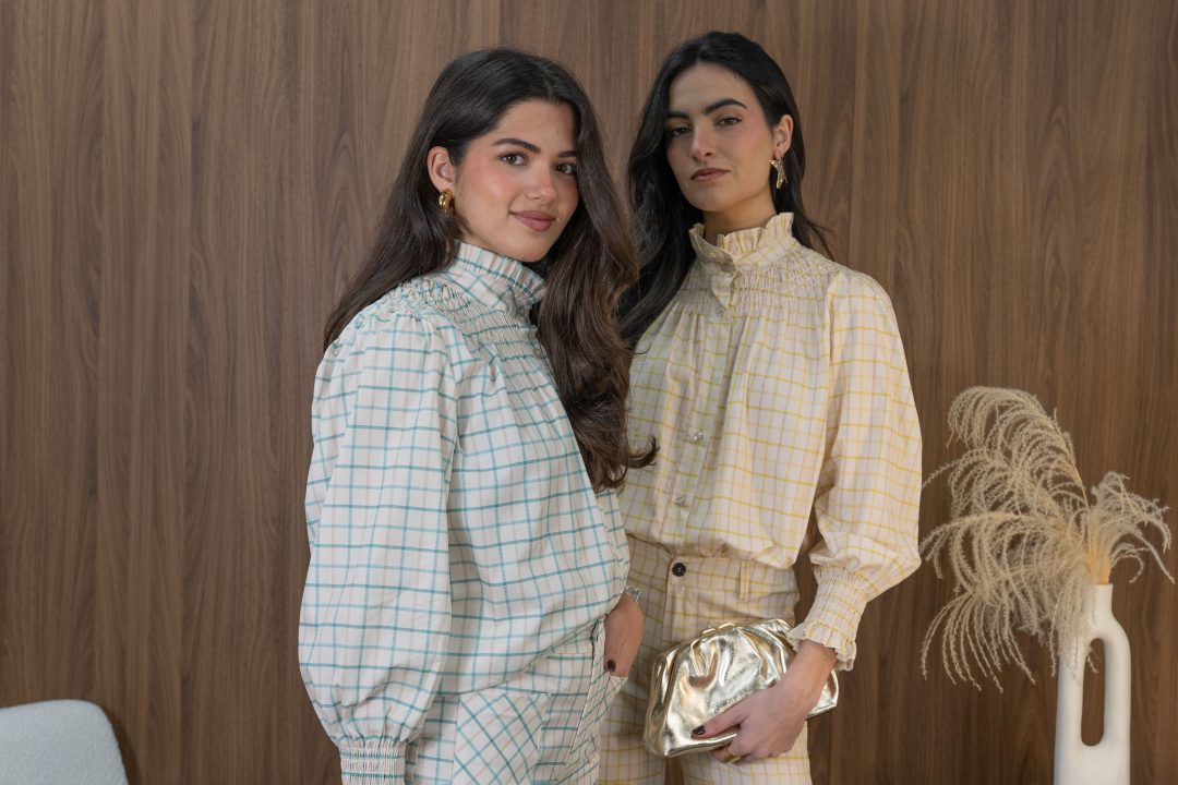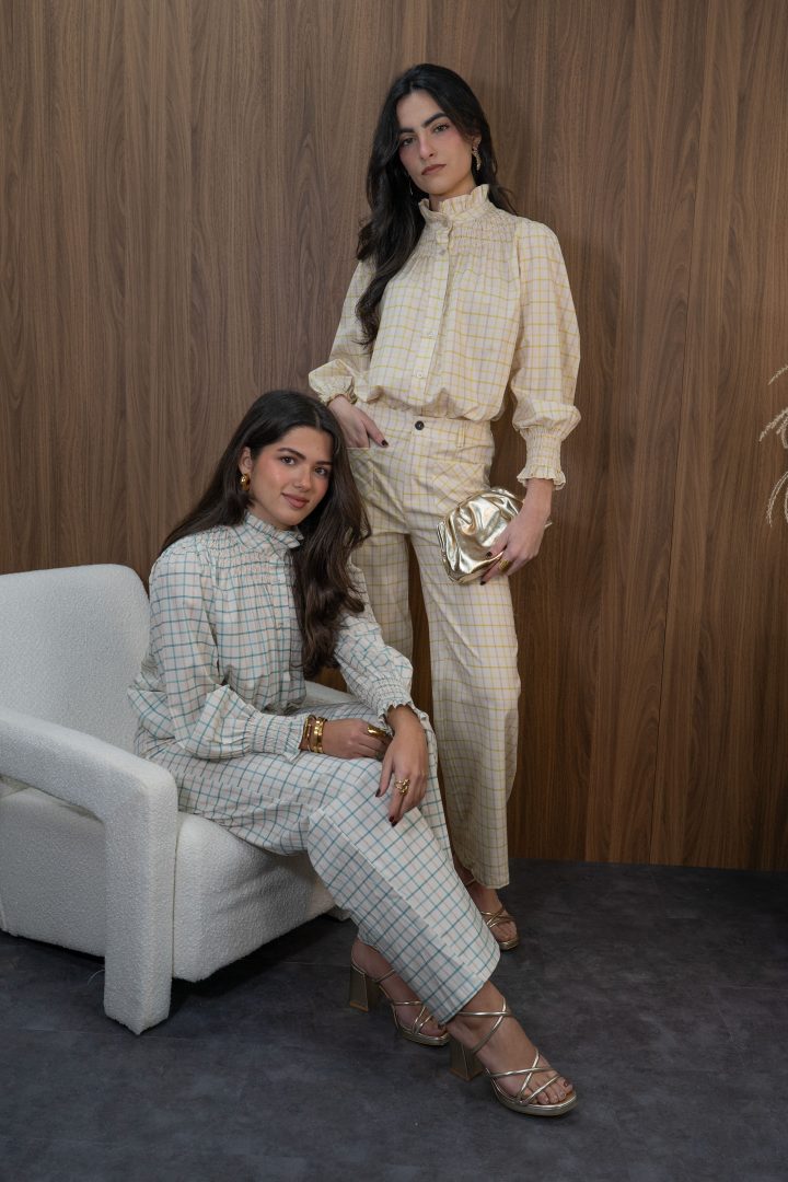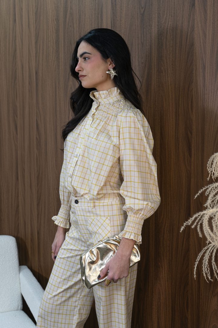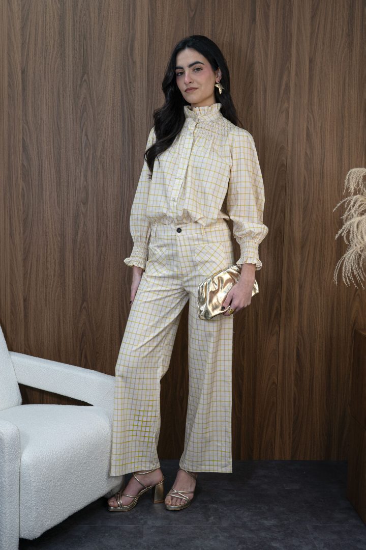 Conjunto de dos piezas compuesto por blusa y pantalón en tono crema con delicado estampado de cuadros en amarillo suave, una propuesta luminosa y sofisticada ideal para eventos especiales.