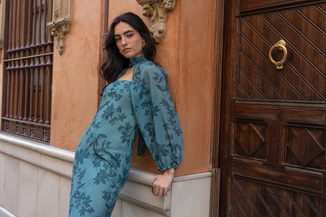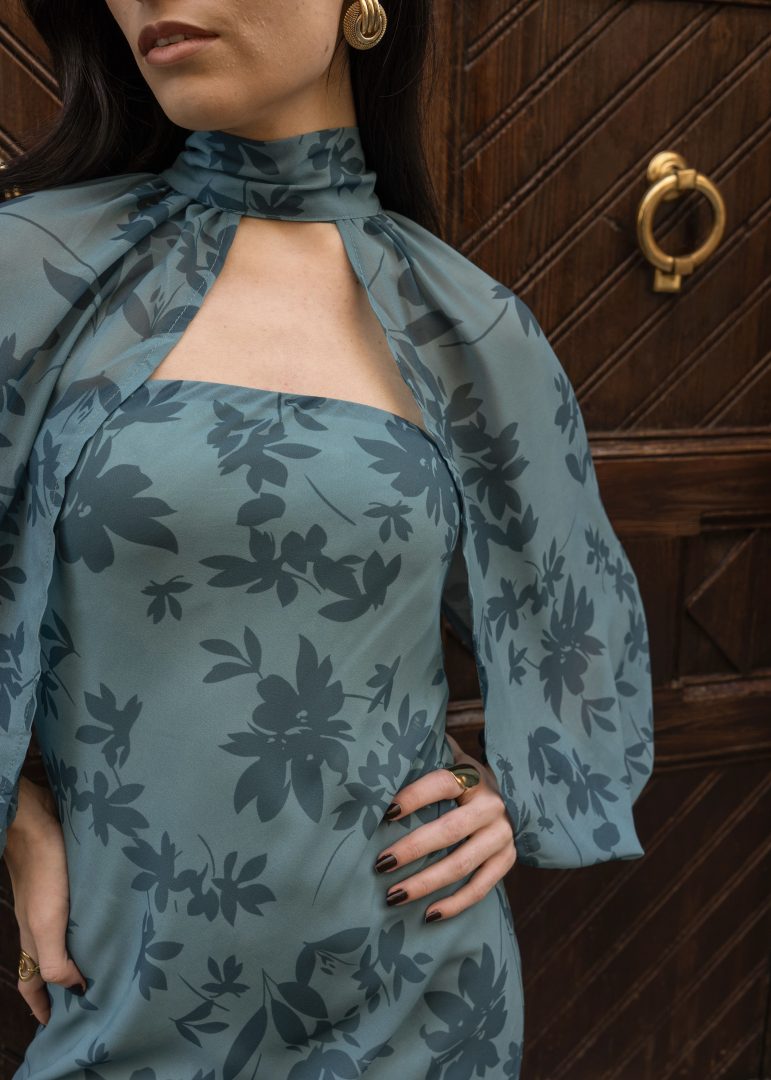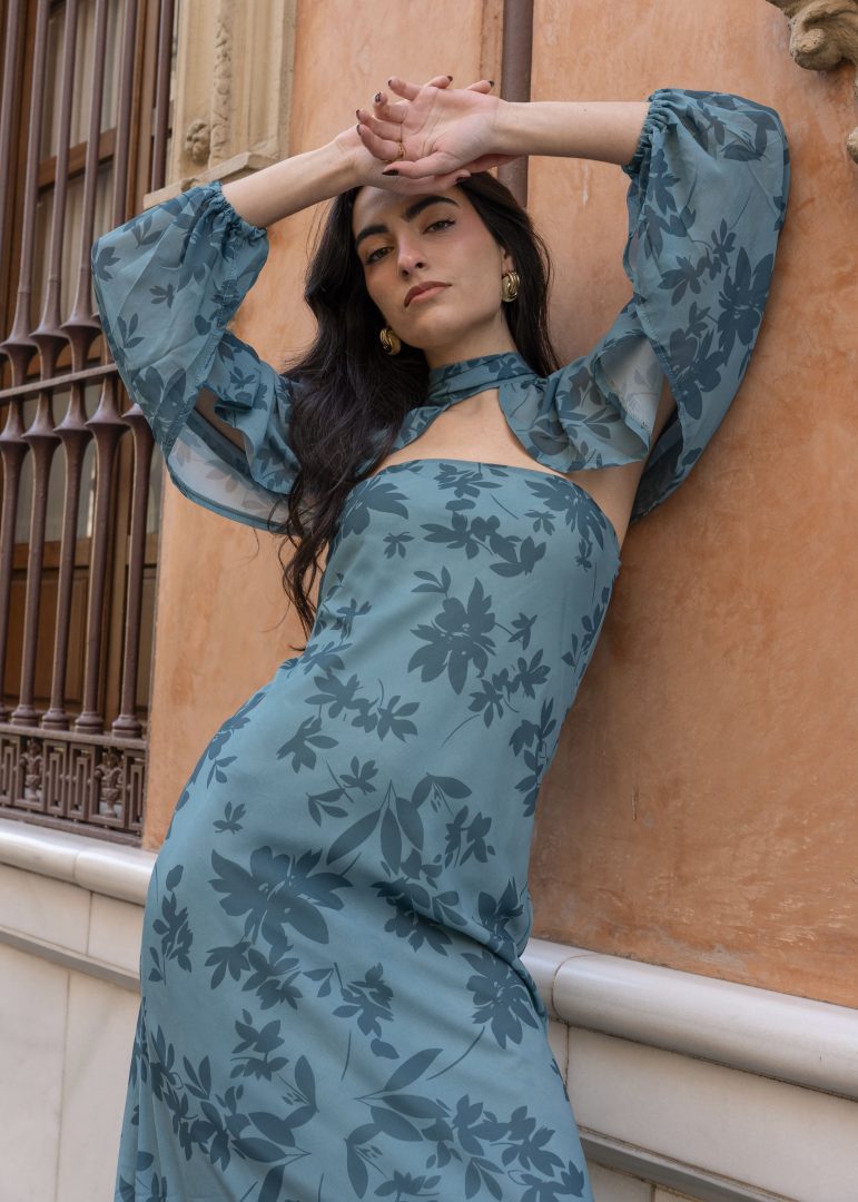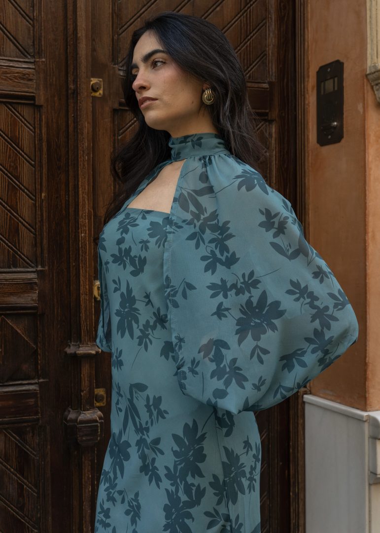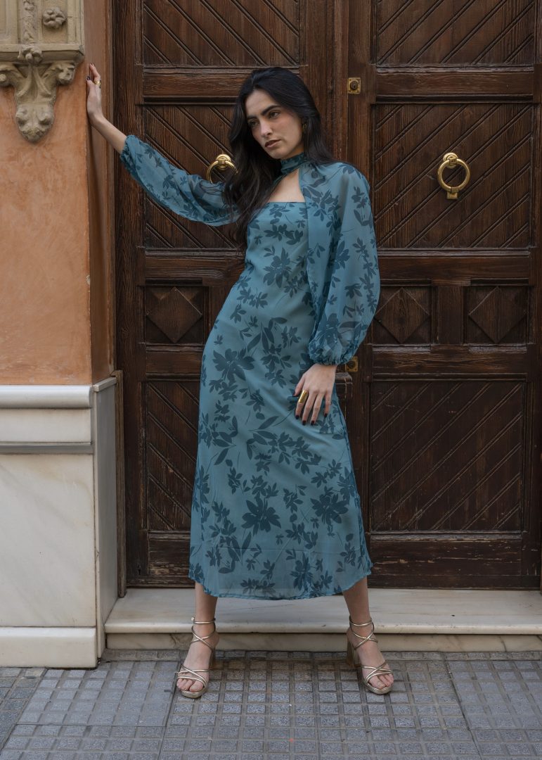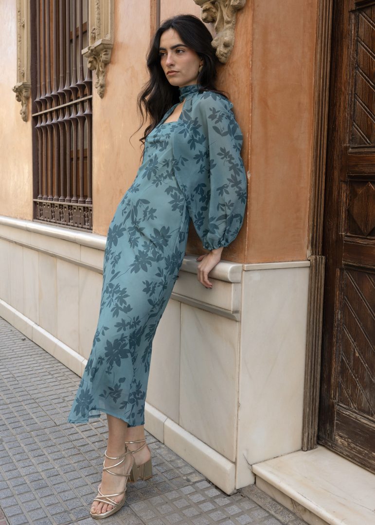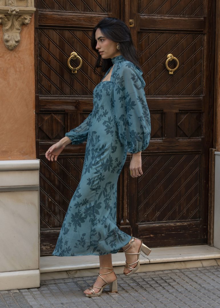 Vestido midi de inspiración sofisticada, confeccionado en un tejido ligero y vaporoso que realza su elegante estampado floral en tono verde petróleo, estilizando así la figura con una silueta fluida y caída natural. Presenta un diseño refinado con escote palabra de honor combinado con cuello alto y sutil abertura frontal, creando un equilibrio perfecto entre modernidad y elegancia. Las mangas largas abullonadas, acabadas en puño elástico, aportan volumen y un aire romántico que eleva el conjunto.